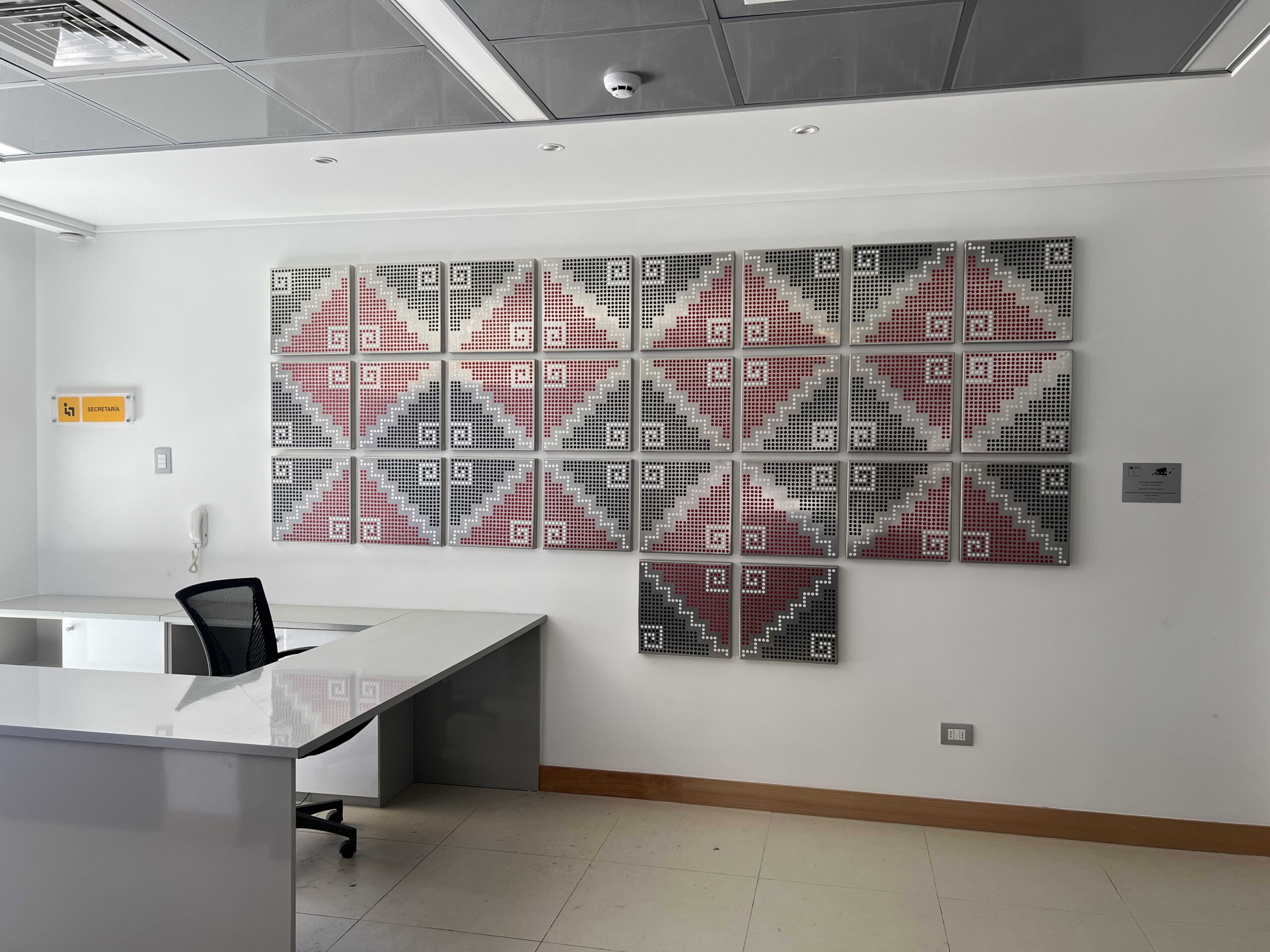 Para este efecto se utilizó círculos de plástico autoadhesivos anti polvo de fabricación industrial, los cuales se adhieren con mucha fuerza en superficies impermeables. Cada uno de ellos, está dispuesto pacientemente a mano hasta generar el patrón diaguita prestablecido. Todo esto sobre 28 módulos de acero inoxidable de 40x40x04 cm c/u. ubicados reticularmente sobre el muro del edificio.