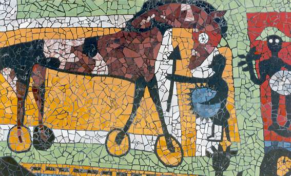 Mural de la artista Lorena Villablanca, (Ejecutado por Paula Camus) quien trabaja con una iconografía de imaginario rupestre, primitivo. En la obra conviven indios con lanzas y escudos, junto a enormes caimanes y caballos, hablándonos de la relación hombre-animal a través de la historia de la humanidad. La obra se emplaza en el patio del Liceo, llenándolo de color y atractivo visual.
