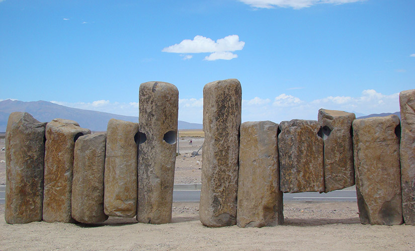La escultura es una línea recta suspendida en el paisaje y colocada perpendicularmente a la línea divisoria de la frontera. A través de ella, se podrán mirar ambos territorios unidos por la perforación que traspasa y ensambla los basaltos como si estás fueran cuentas prehispánicas.